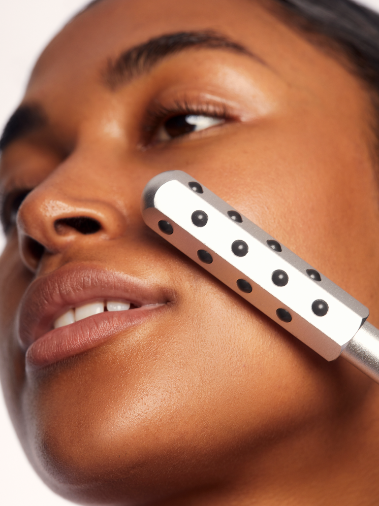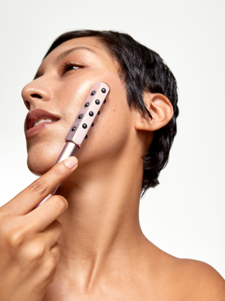 Eleva, ejercita y tonifica los músculos del rostro. Deshincha y esculpe el contorno facial a través del drenaje linfático.